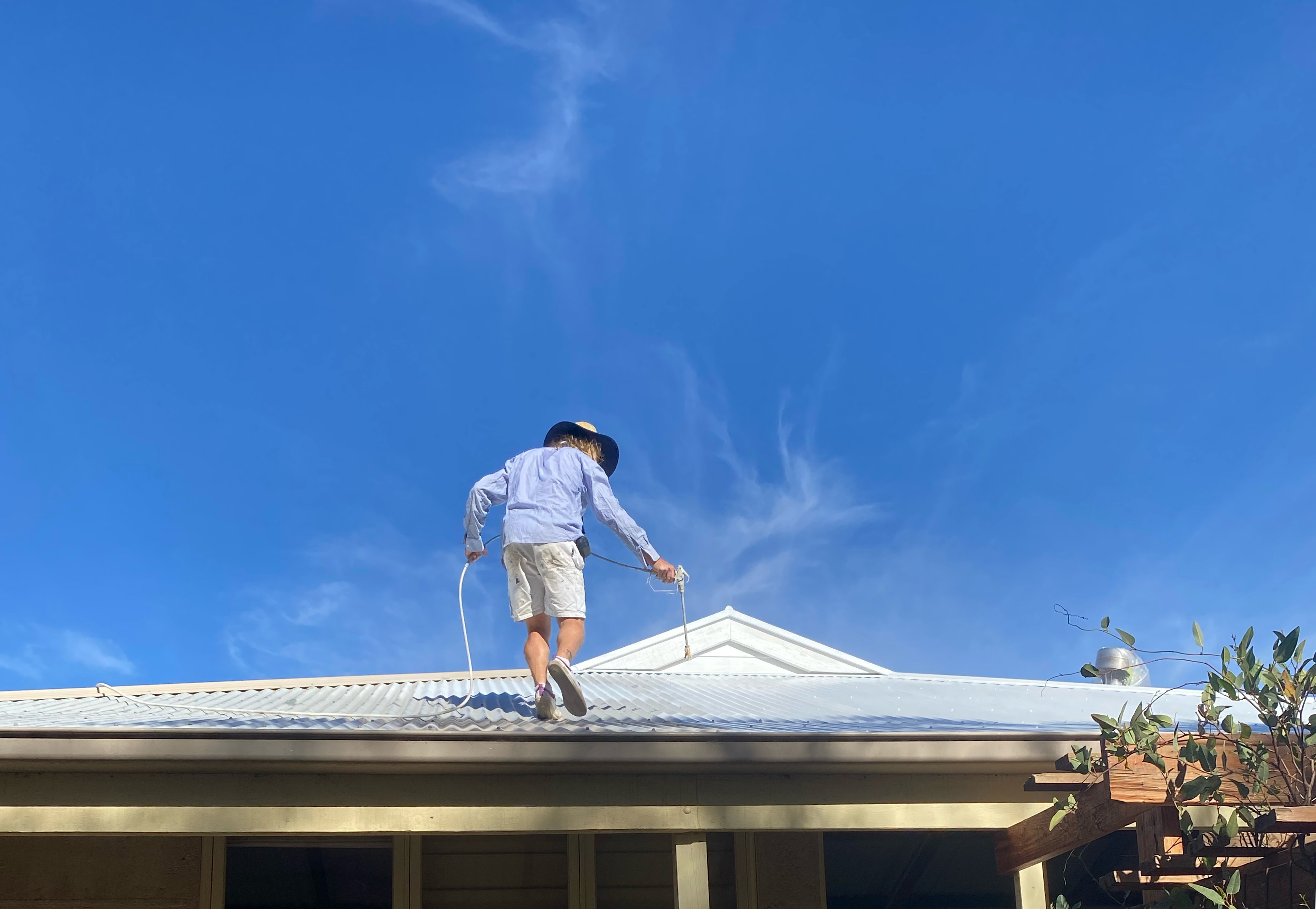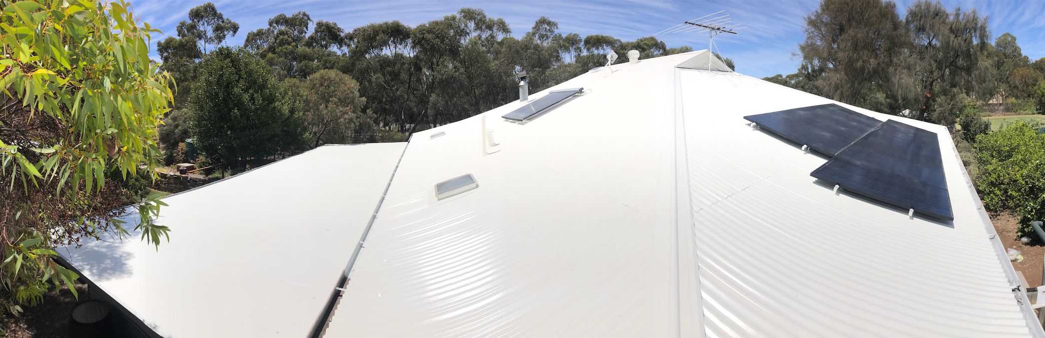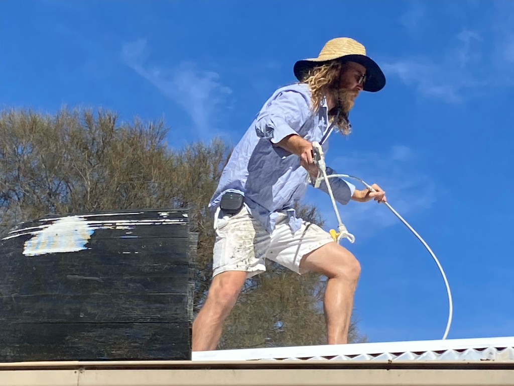 Dylan (Butler) suggested we look at the Solacoat System which is basically a spray on paint which sheds most of the absorbed heat back into the air, leaving less than 2% of the heat reaching the roof surface. We chose the cream colour which has a reflectance of 85%. During our hottest days (38C) recently, the house’s interior temperature was about 23C. Having the roof Solacoated has meant we have had the roof painted with no additional insulation expense.